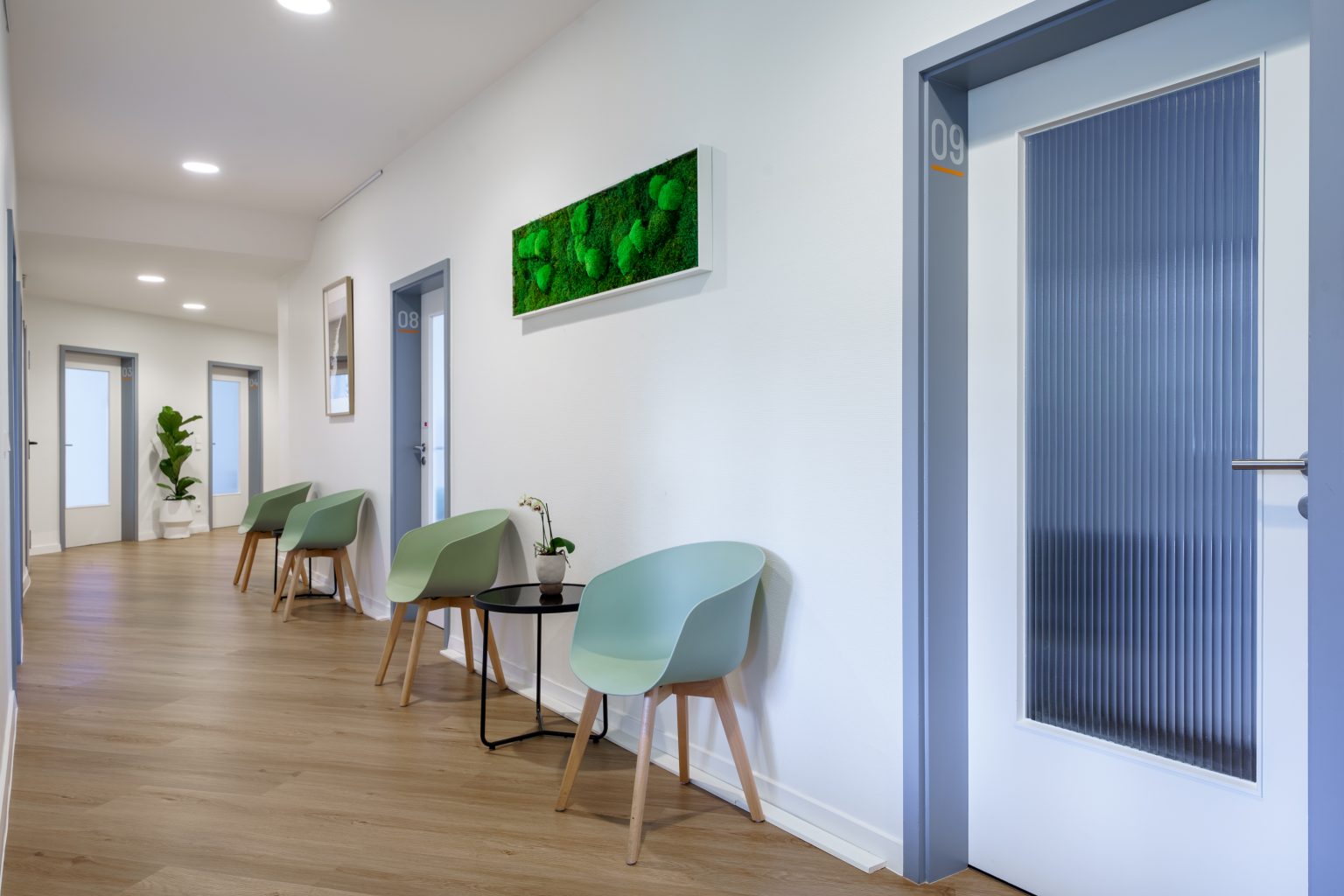 Der Wartebereich wurde für Ihren Komfort und Ihre Ruhe geschaffen – ein Ort, an dem Sie es sich vor Ihrer Behandlung bequem machen können, in Ruhe auf Ihren Therapeuten warten und sich, falls nötig, zwischen den Behandlungen ausruhen können.